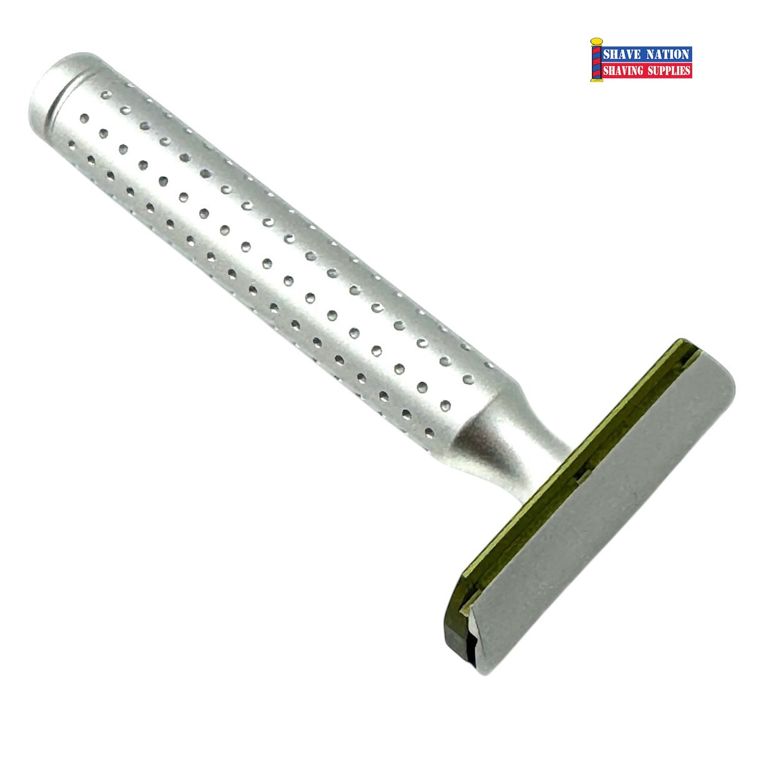 Material: 6061 aluminum with sandblasted high grade anodized silver/aluminum finish & a green colored safety bar plate to signify the eco-friendly nature of this all metal razor